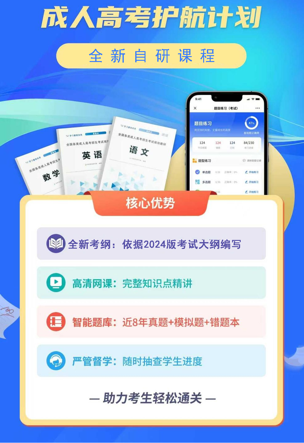 自2024年起,全国成人高考统考科目根据新考试大纲《全国各类成人高等学校招生复习考试大纲》(2024年版)进行命题。本班将由具有多年成人高考教学辅导经验的教师任课,按新考试大纲要求,结合考试题型,针对考试重点和难点进行授课,为广大考生提供系统、精心的考前辅导。采取线上视频教学,全面解析考试大纲,系统讲解章节知识,通过课后习题巩固所学。辅导班更注重点、难点专项突破,把握命题考纲,强化真题演练。备考时间地点不受限制。学院教师提供招生咨询与报名,班主任提供教学管理服务。