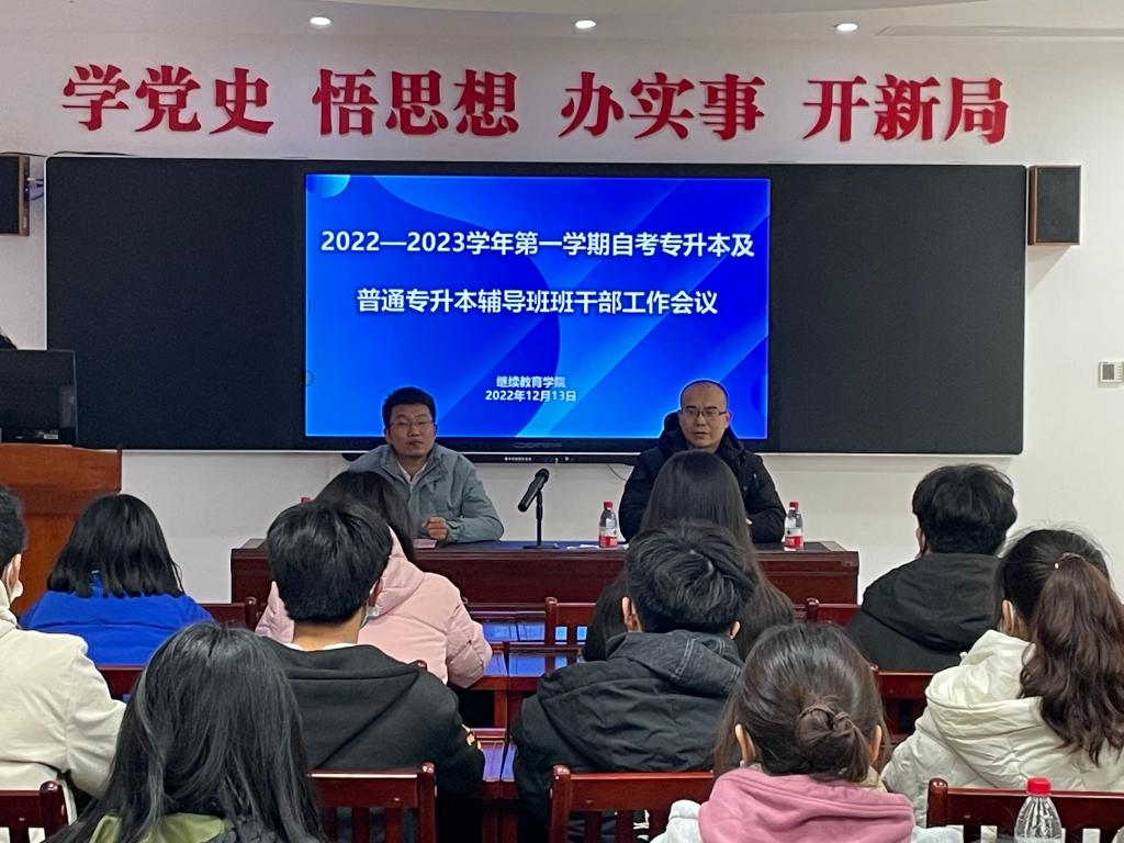 12月13日,继续教育学院召开2022—2023学年第一学期自考专升本及普通专升本辅导班班干部工作会议。学院党总支副书记彭仲文、辅导班班主任及全体班干部参加会议。