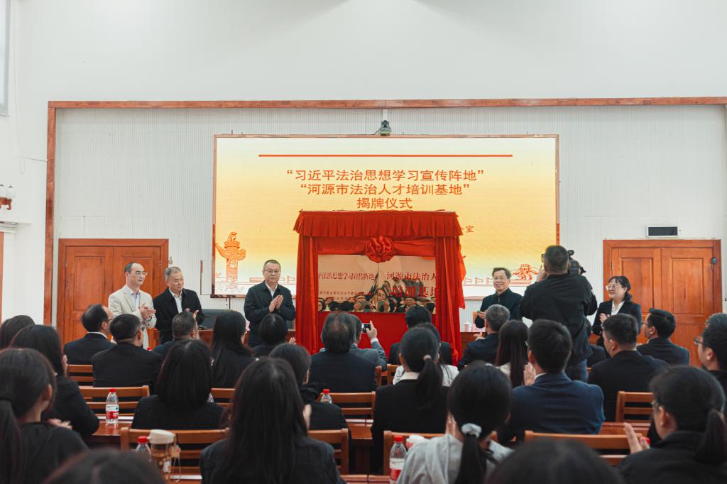 最后,赵峰常委、韦荣书记共同为“习近平法治思想学习宣传阵地”“河源市法治人才培训基地”揭牌。