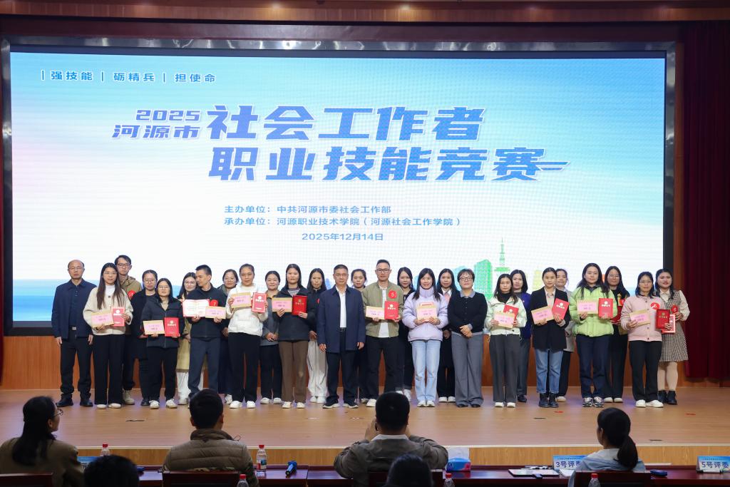 12 月 14 日,由河源市委社会工作部主办、我校承办的 2025 年河源市社会工作者职业技能竞赛在学术交流中心报告厅成功举办。市委社会工作部部长、市委 “两新”工委书记朱永生,我校副校长姚家芳,市委社会工作部副部长彭志波出席活动并为获奖选手颁奖。